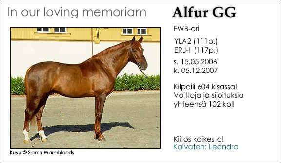 | »Kuollut: | 05.12.2007 20-vuotiaana | »Painotus: | Esteratsastus |